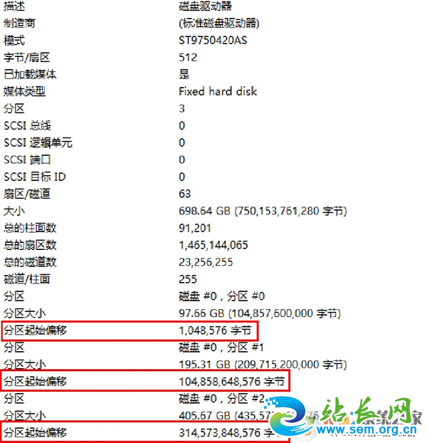 6.4 在右侧找到硬盘驱动器,并将每一个分区起始偏移的值,使用计算器除以 4096 观察能否整除?例如分区 #0 的分区起始偏移 1048576 整除 4096 结果等于 256,则表明该分区已经是 4K 扇区对齐状态。如下图所示: