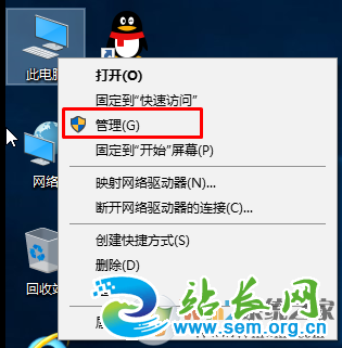 1、首先鼠标右键点击Win10系统桌面此电脑图标,在右键菜单中点击:管理,在打开的计算机管理窗口,点击左侧的磁盘管理。