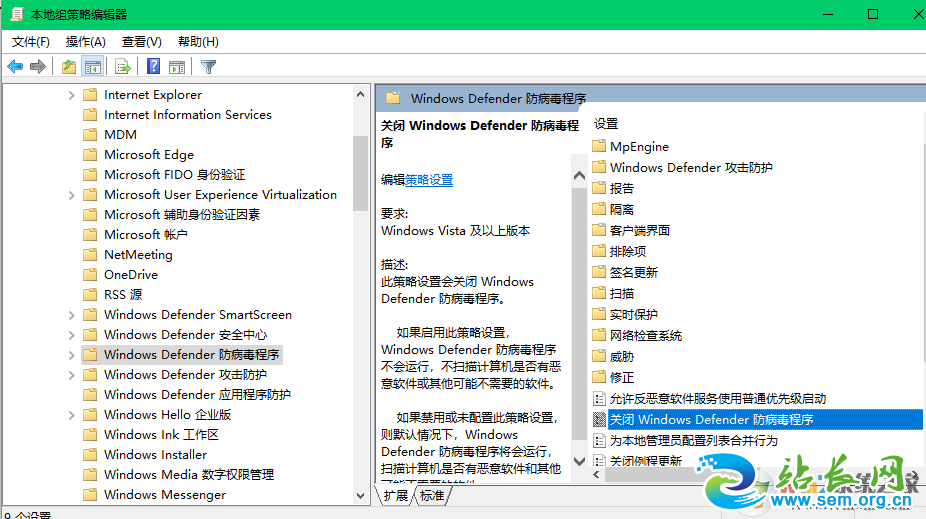 5、选择Windows Defender并双击右窗格中的关闭Windows Defender选项。