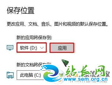 3、在左侧【保存位置】下将【新的应用将保存到】下拉菜单选择其他www.winwin7.com磁盘,点击【应用】,如下图所示:
