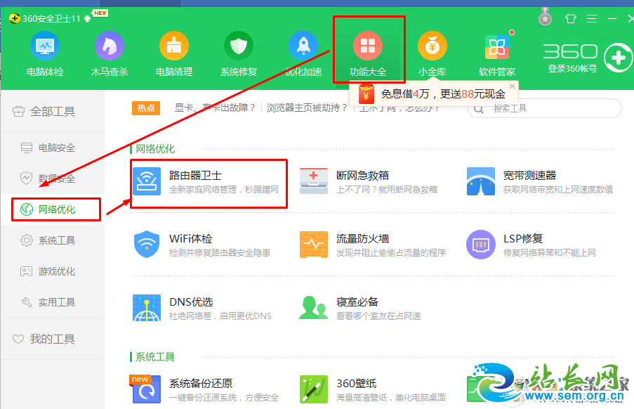 1、打开360安全卫士,点击功能大全----网络优化---路由器卫士。