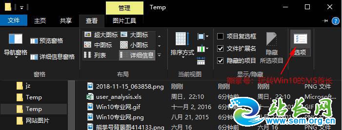 2、在Ribbon功能区的最右侧选择“选项”按钮,打开“文件夹选项”窗口,切换到“查看”选项卡。如图: