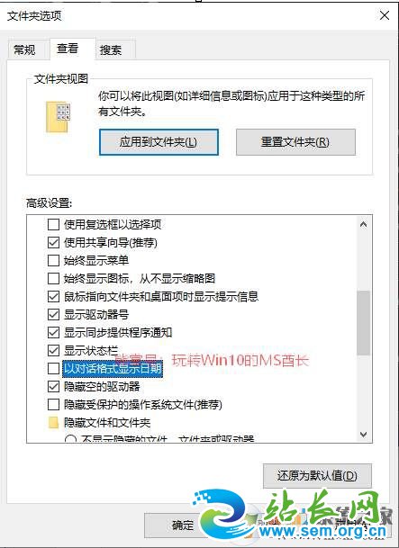 在下面的“高级设置”窗格中向下滚动,在“文件和文件夹”设置区域找到“以对话格式显示日期”设置项,取消勾选,应用或确定。