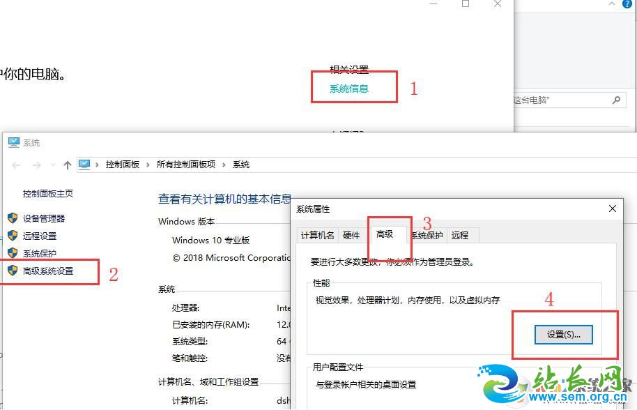 2、然后打开系统信息,找到高级系统设置 -> 高级 -> 设置