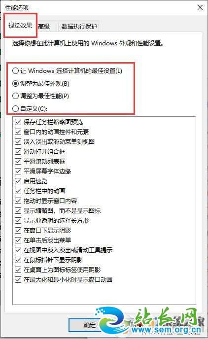 3、点击上一步的设置之后,在弹出的小窗中修改外观配置,可以自定义勾选,也可以使用快捷设置(调整为最佳外观),修改完之后点击应用,电脑有可能会卡一下稍等就好