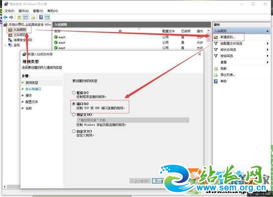 5、设置入站规则(入站规则:别人电脑访问自己电脑;出站规则:自己电脑访问别人电脑),点击“新建规则”,点选“端口”,单击 “下一步”;