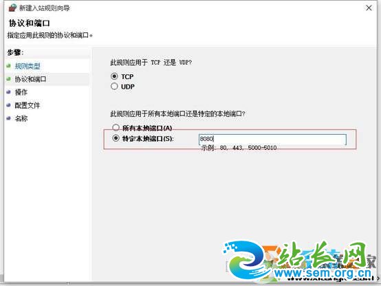 5、选择相应的协议,如添加8080端口,我们选择TCP,在我写本地端口处输入8080;如果是防病毒,可关闭135,137,445端口