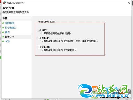 7、勾选“域”,“专用”,“公用”三个选项,点击“下一步”;