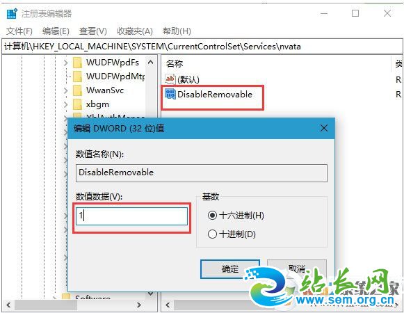 4、只需要双击:DisableRemovable,就可以编辑 DWORD (32 位)键值,然后在编辑窗口中将数值数据修改为 1,最后点击确定即可,如下图所示;