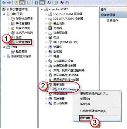2、在“计算机管理”窗口左边一栏,双击“设备管理器”。然后,从右边栏中找到“图像设备”,点开。在摄像头设备上右键鼠标,选择“属性”。