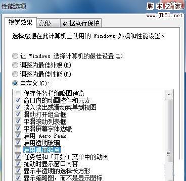 最后,在“视觉效果”标签下,取消系统默认勾选的“启用桌面组合”(如图3):