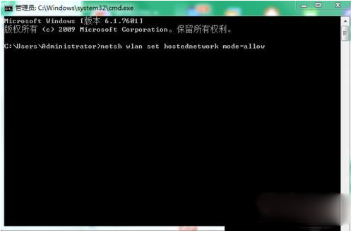 2、把引号里这串代码复制黏贴到里面(不包括引号)“netsh wlan set hostednetwork mode=allow”回车;