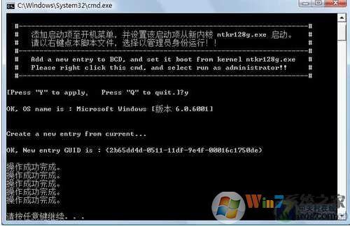 然后运行压缩包里面的AddBootMenu程序,当弹出对话框时,输入Y回车即可,此时系统提示破解操作成功完成。