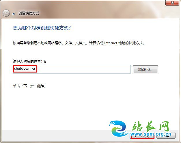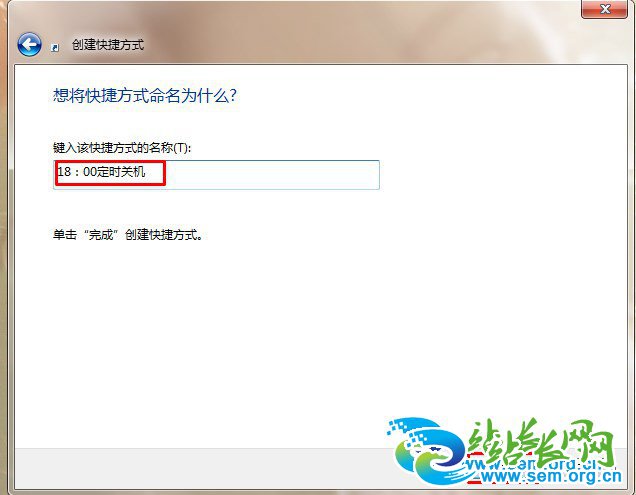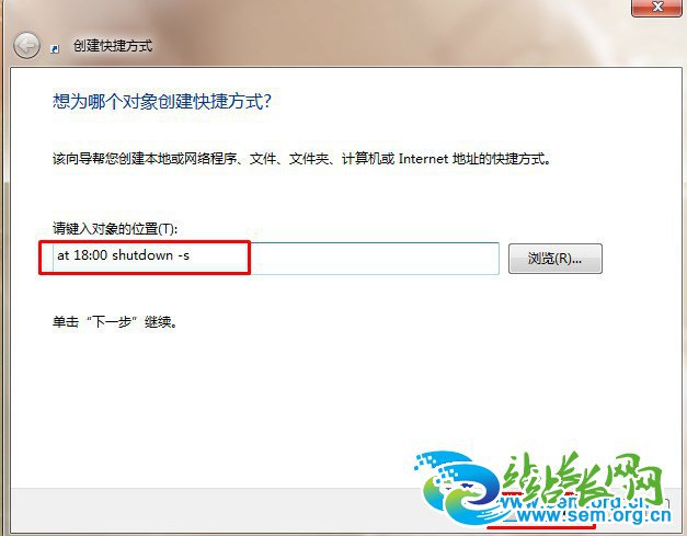 2、点击【快捷方式】后:输入【at 18:00 shutdown -s】在对像位置。