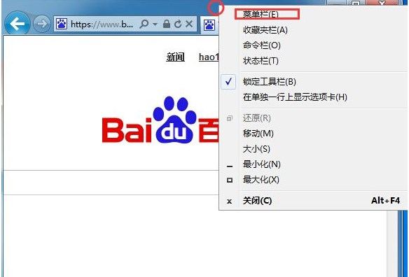 方法一、我们打开IE后,在IE浏览器顶部点击鼠标右键,然后在弹出的右键菜单中,勾选“菜单栏”,如下图