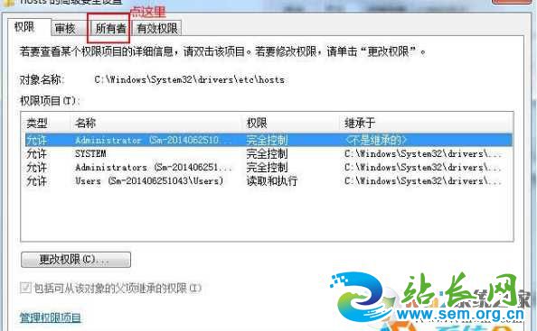 3、Windows7旗舰版在高级安全设置界面,切换到【所有者】选项卡;
