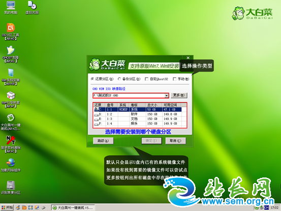 3、进入PE后运行【大白菜一键装机工具】,然后选择你要安装的系统GHO,之前你要是使用过一键重装系统的话应该还有gho文件留在d盘,选择这个镜像的话安装过程会比较快,再选中你要安装的分区,大多为C盘。