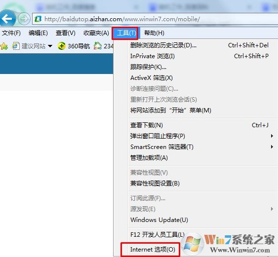 2、接着在工具菜单下,打开internet选项。
