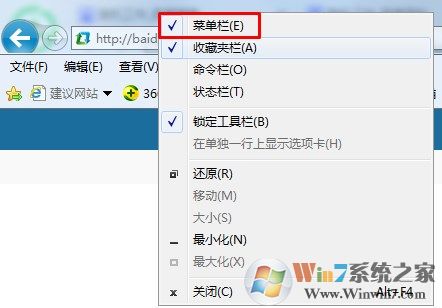 1、打开ie以后,在空白的位置右键单击,勾选【菜单栏】调出菜单栏。