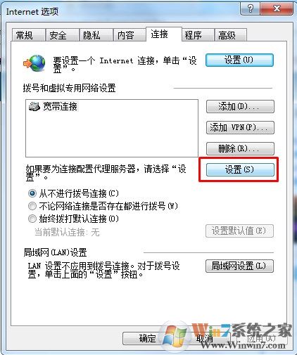 3、在internet选项中,切换到【连接】选项,然后点击【设置】,如图所示。
