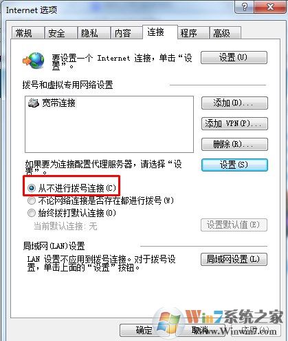 5、返回到internet选项,然后查看一下你是否设置的是【从不进行拨号连接】如图所示。