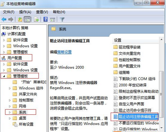 3、这时候我们可以在右侧窗口中找到【阻止访问注册表编辑工具】项;