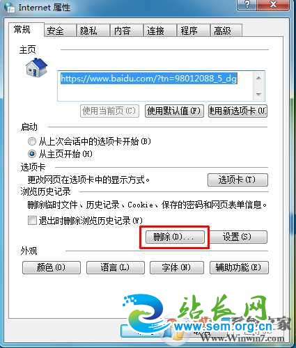 1、还是打开internet选项,然后点击 删除 按钮,如下图: