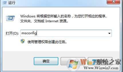 1、在运行窗口中输入命令msconfig,并确定;www.winwin7.com