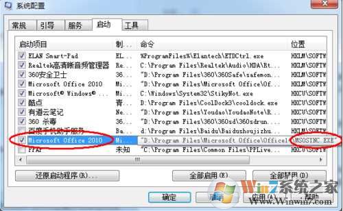 2、打开系统配置窗口。 在系统配置窗口中,点击启动,切换到启动界面,在启动项目中找到Microsoft Office 2010,有可能有多个Microsoft Office 2010,再查看相应的命令中带有MSOSYNC.EXE的,取消此启动项目,并确定退出系统配置窗口,然后重启电脑。重启电脑后发现任务栏中就不会有上载中心的图标了。