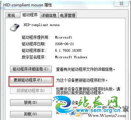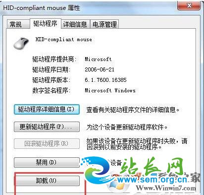 5、在鼠标属性页中,有关于驱动程序的详细信息,在最下面是一个卸载按钮,这就是卸载驱动的按钮,用鼠标点击这个卸载按钮,卸载当前的鼠标驱动。