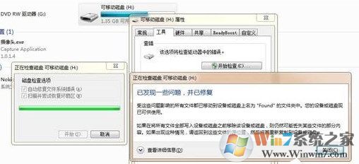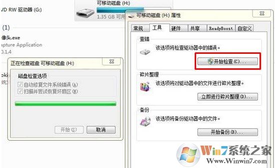 2、单击查错一项--》开始检查,在弹出的窗口中一定要选中“自动修复文件系统错误和扫描并尝试恢复坏扇区”两个选项,点击开始查错,一般会根据不同手机内存卡的大小和存储内容的多少来确定所要检查时花的时间,我的U盘16G用了2G多,花了近15分钟。