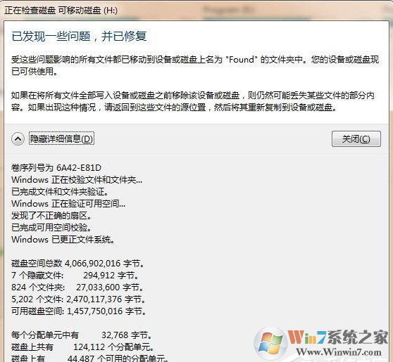 4、如果想知道具体出现什么问题,可以单击“查看详细信息”,在其列表中会显示出修复的具体内容和情况。可以看得出是扇区和文件系统有点问题。