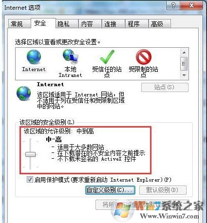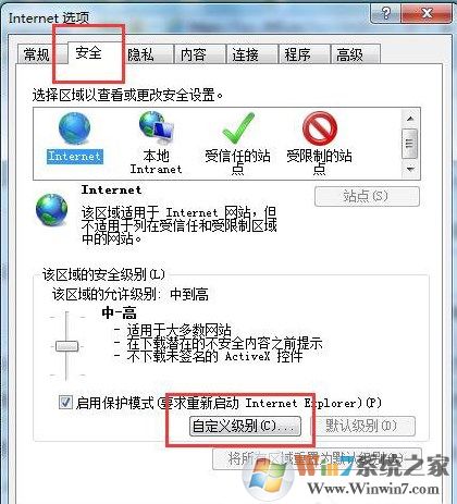 2、点击“安全”进入“Internet”点击“自定义级别”。