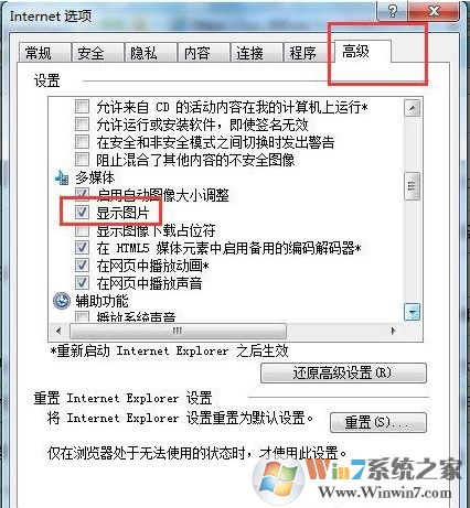 6、在Internet选项中点击“高级”勾选“显示图片”后确定。