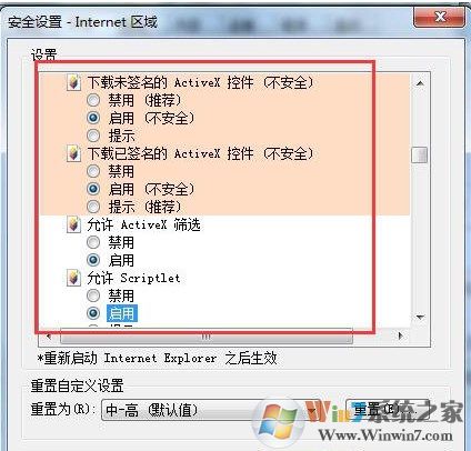 3、在“对标记为可安全执行脚本的ActiveX控件执行脚本”后点击“启动”,在“对未标记为可安全执行脚本的ActiveX控制初始化并执行脚本(不安全)”。