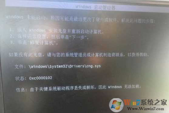 cng.sys文件应该是某个驱动,在系统启动时需要加载,而出现损坏后加载不了就出现不能启动或蓝屏了。