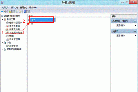 2、“计算机管理”界面下点击“本地用户和组”,界面右侧双击选择“用户”。参见下图