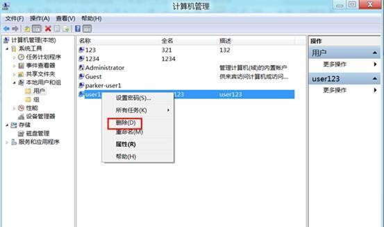 3、弹出所有用户账户后右键选择将要删除账户“user123”,点击“删除”选项。参见下图