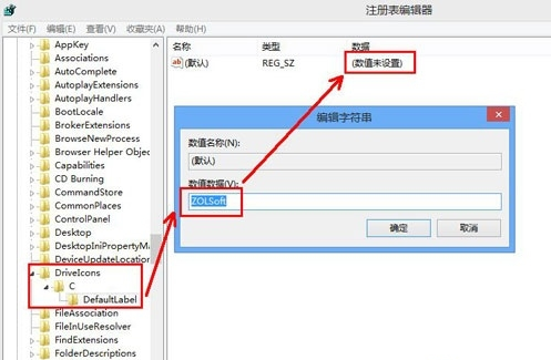 ④进入DefaultLabel,打开并修改字符串值为“ZOLSoft”。全部进行之后,我们对磁盘分区故障的处理完毕,用户可以亲自来验证一下修改的效果了。