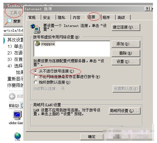 在IE栏中有个工具选项,单机打开,现在intelnet选项——连接——从不进行拨号连接 ——确定就可以了,如图: