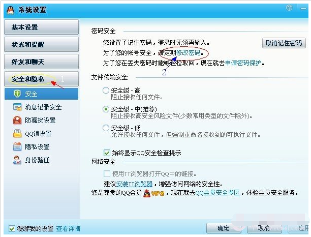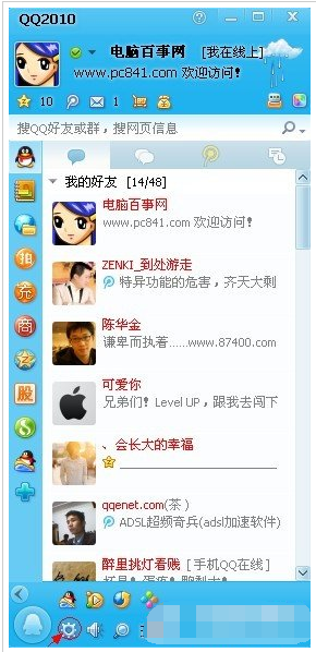 如上图,我们登陆QQ后可以在底部界面看到一个带齿轮样式的设置图标,如上图底部红色所指的箭头位置,我们只需点击进入就可以进入QQ各类设置了,其中就包含了安全设置,进入设置界面后我们先点点击左侧选择"安全与隐私"然后在右侧即可看到QQ密码更改提示入口了WWW.PC841.COM电脑配置,如下图: