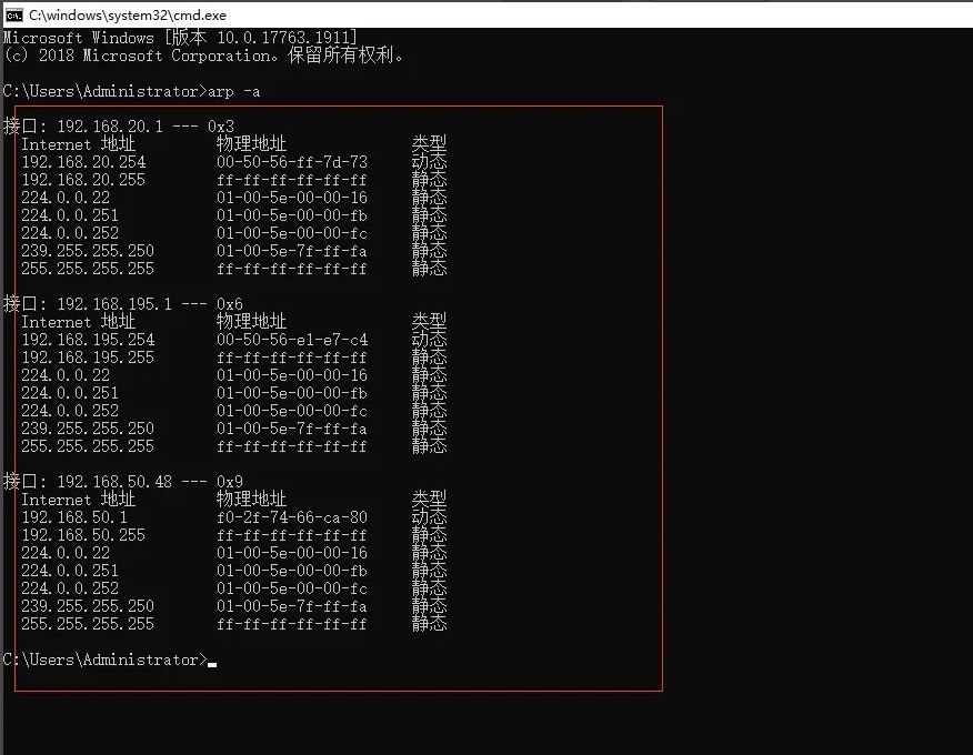 从返回结果可以看到本地局域网中的所有与本机通信的计算机IP地址。