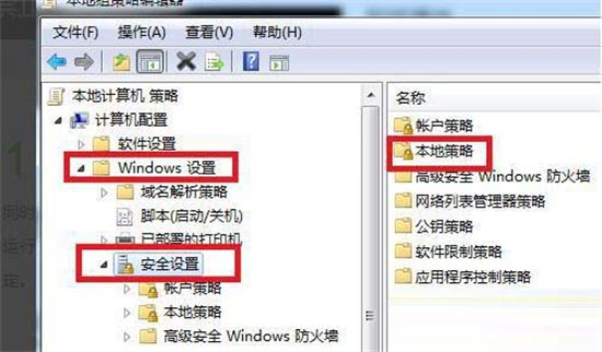 2、在本地组策略编辑器中找到“windows设置”并点击,打开“安全设置”,然后找到“本地策略”并点击。