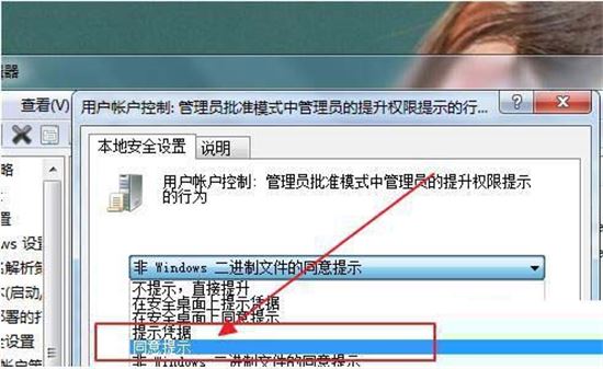 5、在这里是本地安全设置,我们把“非windows二进制文件的同意提示”改为“同意提示”。