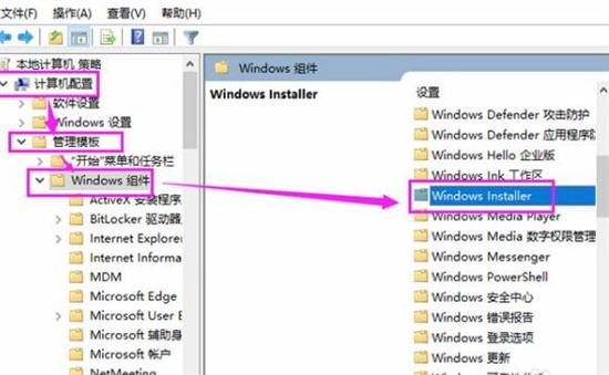 2、然后进入到本地组策略编辑器的窗口,点击左侧的【计算机配置】-【管理模板】-【Windows 组件】,在右侧找到【Windows Installer】。