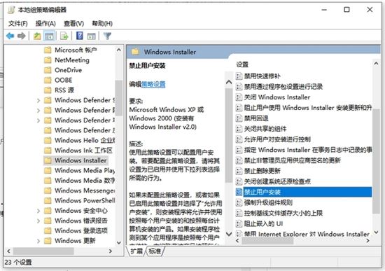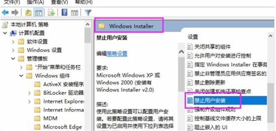 2、然后依次展开“计算机配置”---“管理模板”---“Windows组件”---“Windows Installer”,双击打开“禁止用户安装”。