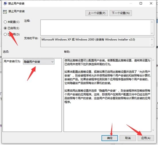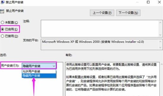 4、最后双击打开【禁止用户安装】窗口,将【未配置】改为【已启用】,在下方【用户安装行为】后面,选择【隐藏用户安装】,别忘了点击确定哦。