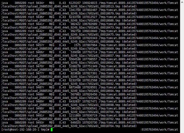 3、由于tmp为临时文件夹,文件使用结束后自动删除,猜测存在文件被删除但是空间未释放的情况。通过 lsof /tmp 查看文件情况,发现有大量的文件被删除但是依旧被进程占用,导致无法释放空间。