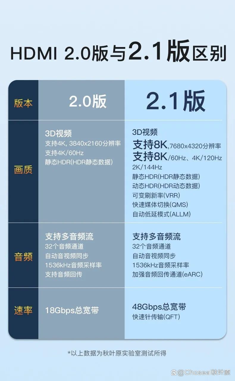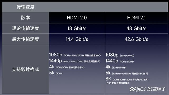 主要差异在于传输速度,HDMI2.1理论传输速度可以支持48Gbit/s,HDMI2.0理论传输速度可以支持18Gbit/s。2.1比2.0的速度更快。