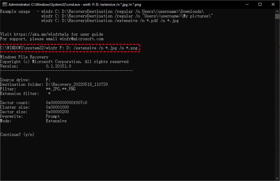 然后按y继续并等待过程完成。使用此命令,你可以将jpeg和jpg文件从U盘设备恢复到另一个驱动器。将在目标磁盘中自动创建一个名为“Recovery_日期_时间”的文件夹。
